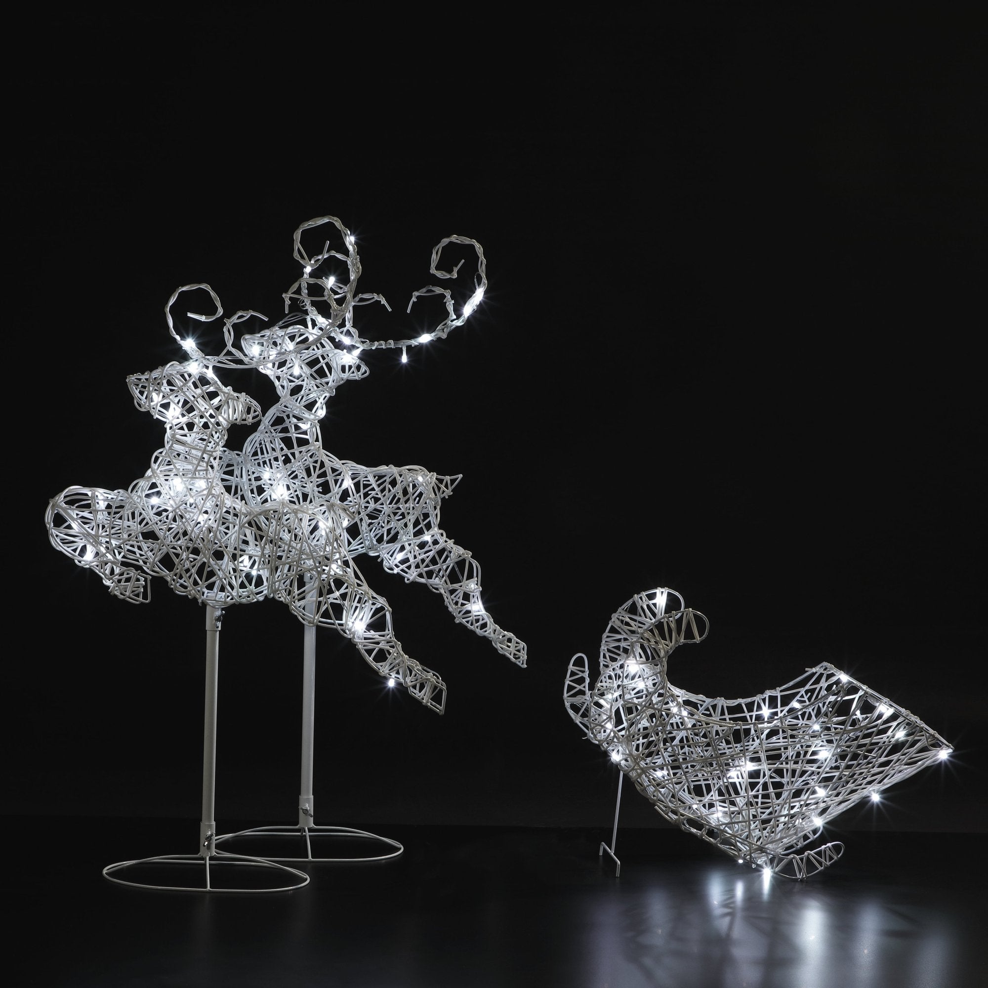 Illuminate your holiday season with our stunning 96cm Two Reindeer Sleigh, featuring a beautiful white rattan finish and 90 colour-changeable LEDs. Easily control your lighting effects using the included NOMA remote, allowing you to choose from a variety of colours to create the perfect festive atmosphere. Designed for both indoor and outdoor use, this sleigh boasts a durable white wire frame and a generous 10m lead cable for flexible placement. With its built-in timer for convenient operation and low voltage for safety, this enchanting decoration is sure to bring joy and magic to your holiday décor!