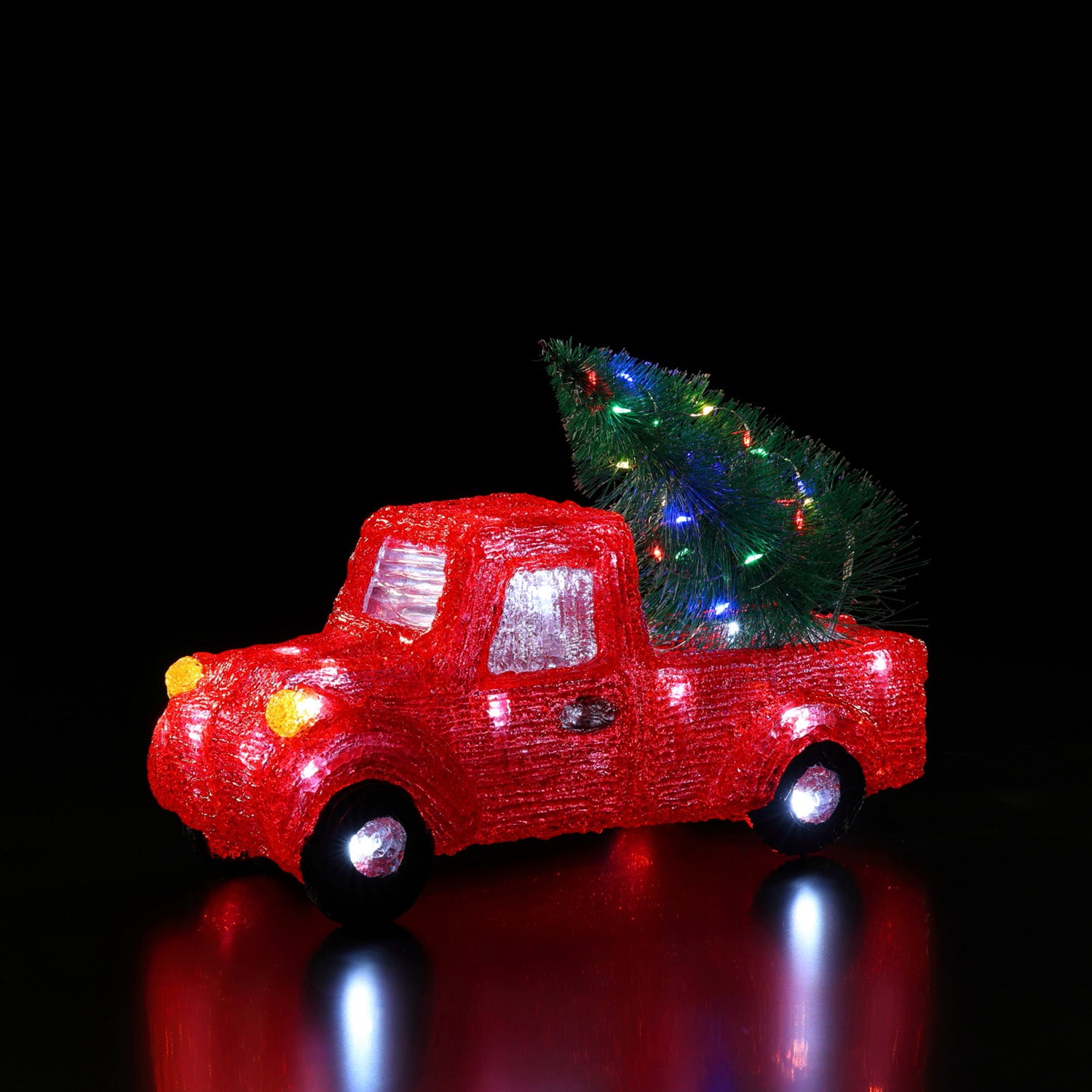 Drive holiday cheer into your home with this charming light-up red truck carrying a Christmas tree! This nostalgic decoration features a glittering red pickup, complete with glowing headlights, illuminated windows, and a beautifully lit Christmas tree in the back.