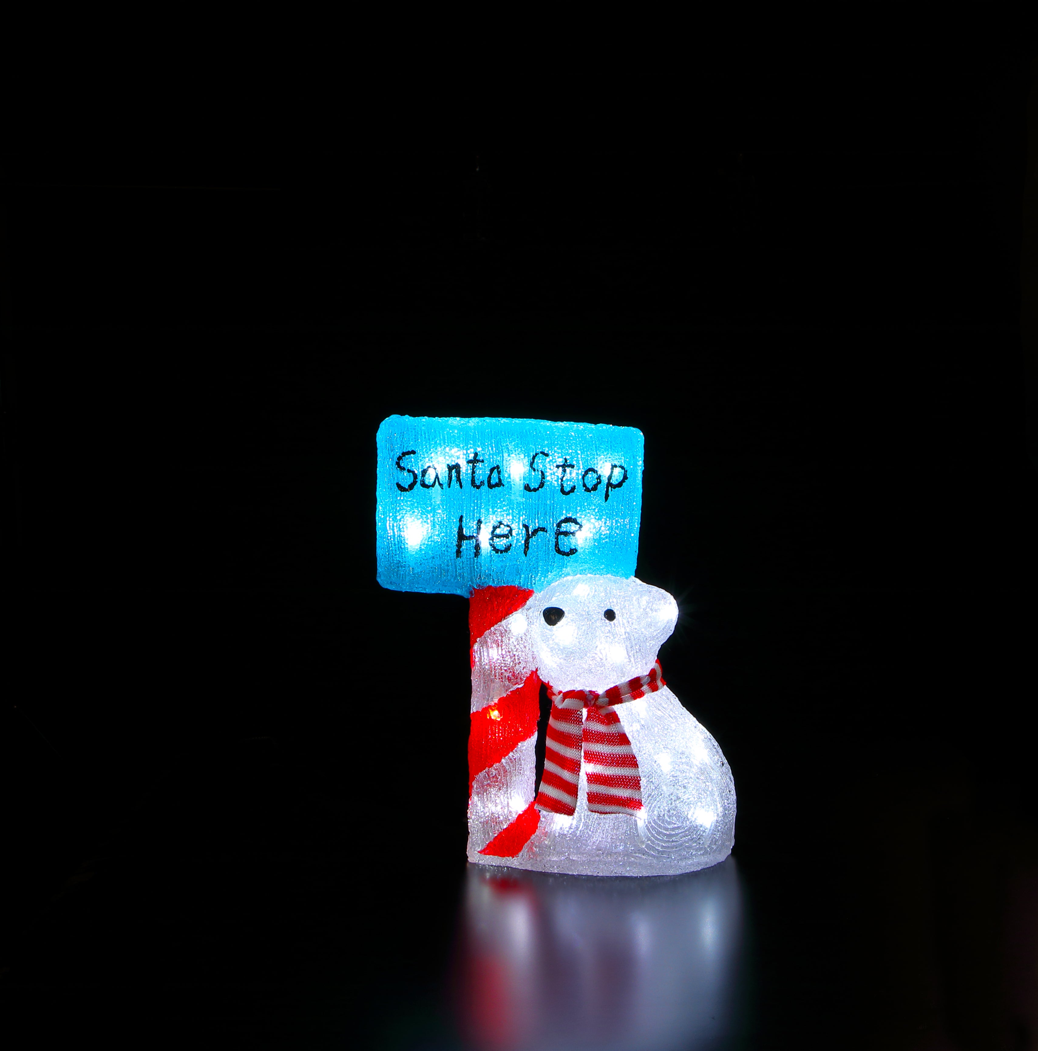 Bring festive cheer to your home with this charming light-up polar bear holding a bright blue “Santa Stop Here” sign. Crafted with a frosted finish and illuminated from within, this adorable bear shines warmly in the dark, creating a magical holiday atmosphere.
