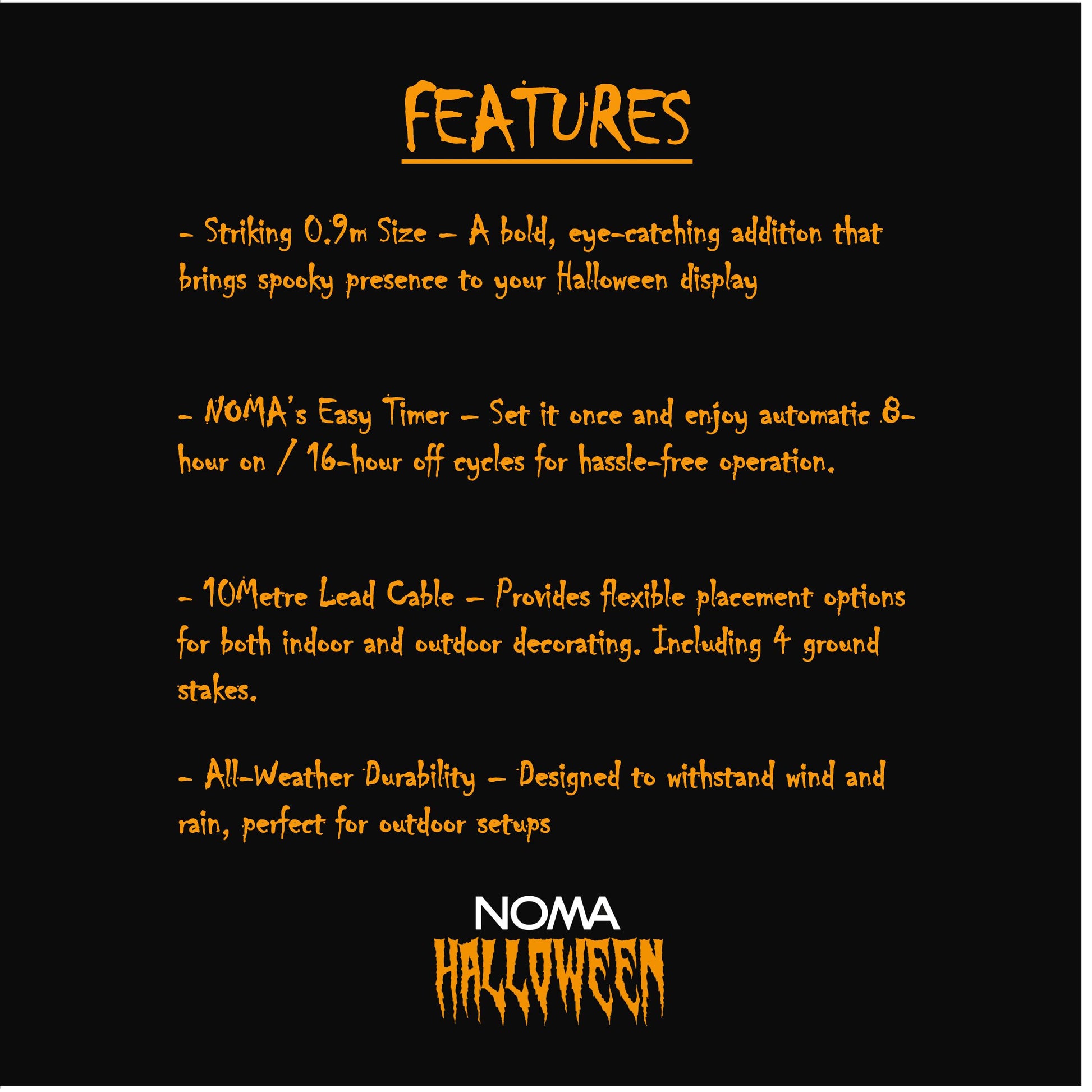 Make your Halloween display unforgettable with this 1.2m Inflatable Crawling Grim Reaper. Featuring 4 glowing LEDs, a 5m lead cable, and NOMA’s Easy Timer for effortless control. Comes complete with 4 ground stakes and 2 ropes, perfect for both indoor and outdoor use.