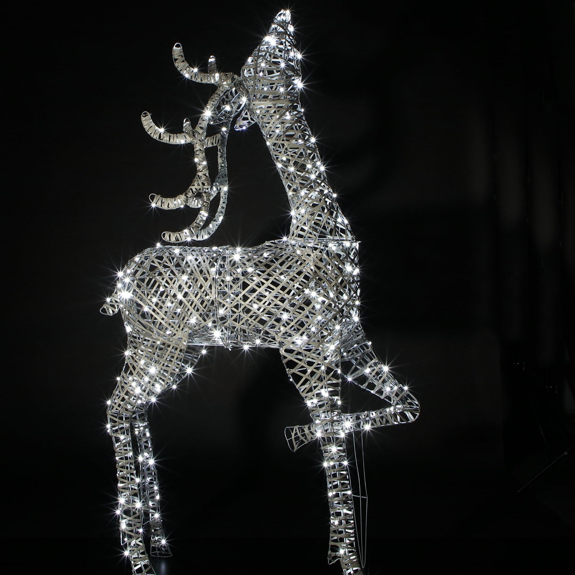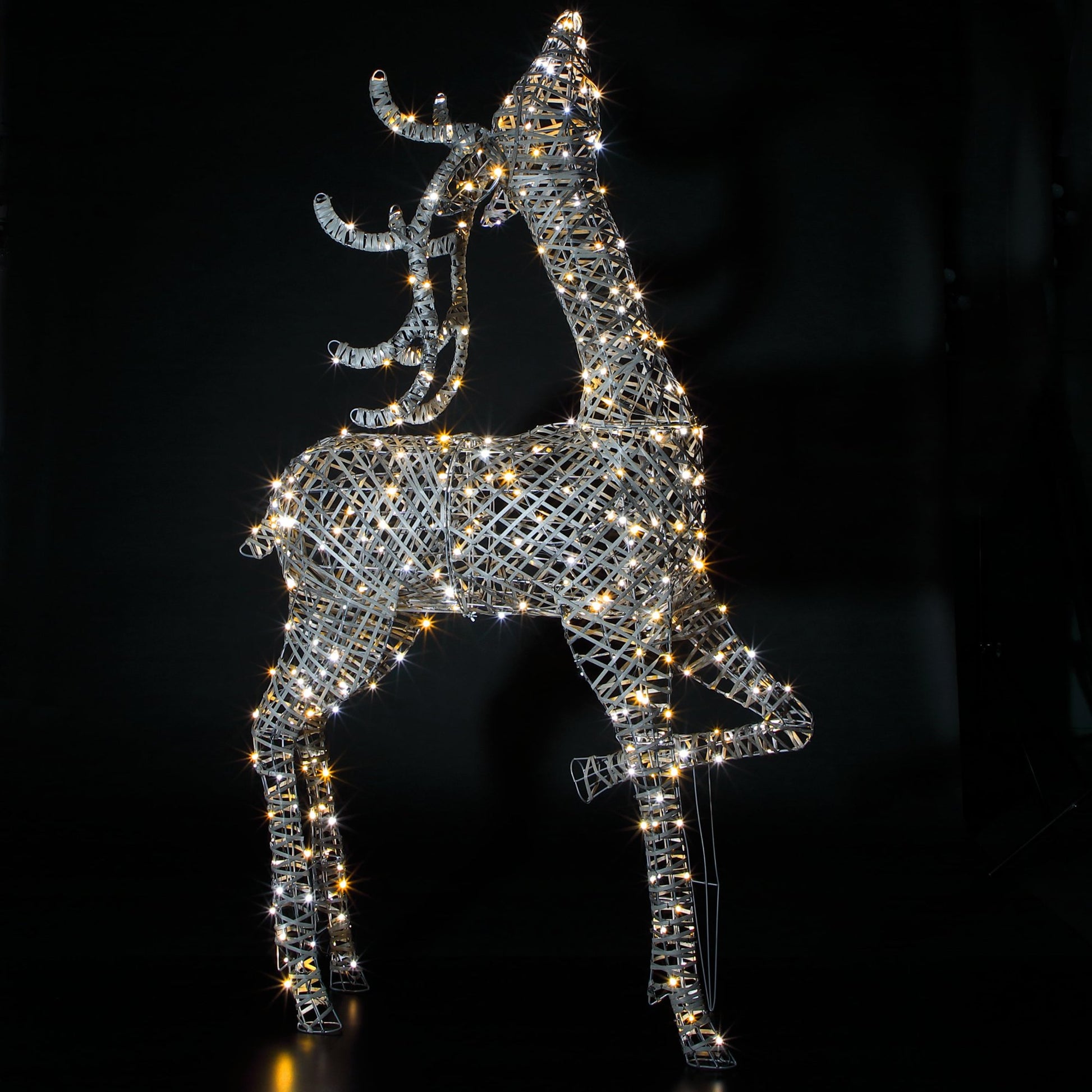 Enhance your festive display with our elegant 2m Grey Duo Bulb Blenheim Stag. Standing tall and crafted from multi-tonal grey rattan, this majestic stag is adorned with 400 duo LEDs that allow you to choose between warm white, bright white, or a dazzling mix of both.