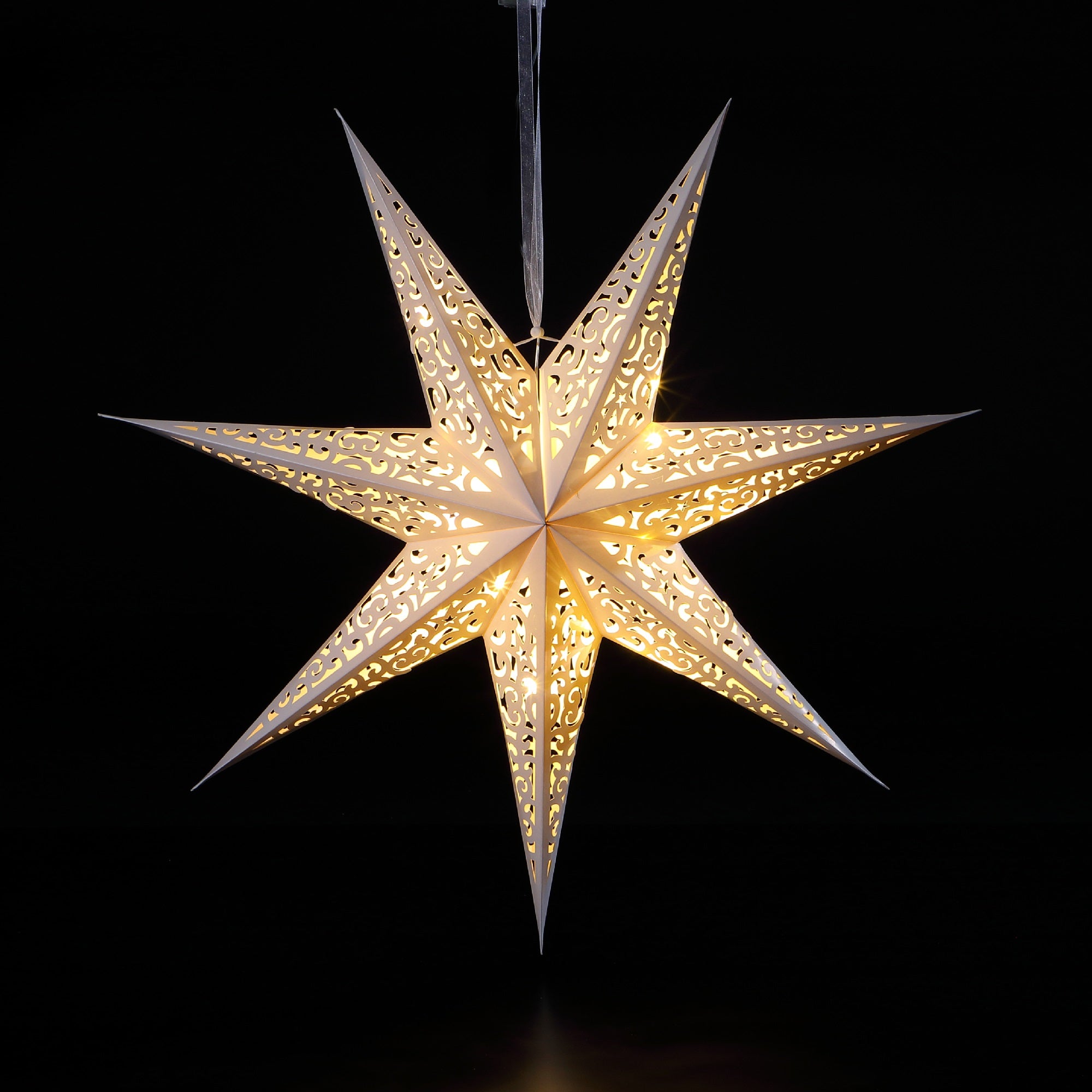 Add a touch of elegance to your holiday décor with the 60cm Paper Shining Star. This stunning white filigree star features 20 warm white LED wire lights that create a beautiful, gentle glow. Designed for easy setup with quick assembly and an included hanging ribbon, it also offers an On/Off/Timer function for convenient operation. Perfect for enhancing any indoor space, the Paper Shining Star combines style and sparkle to bring a sophisticated, festive ambiance to your home.