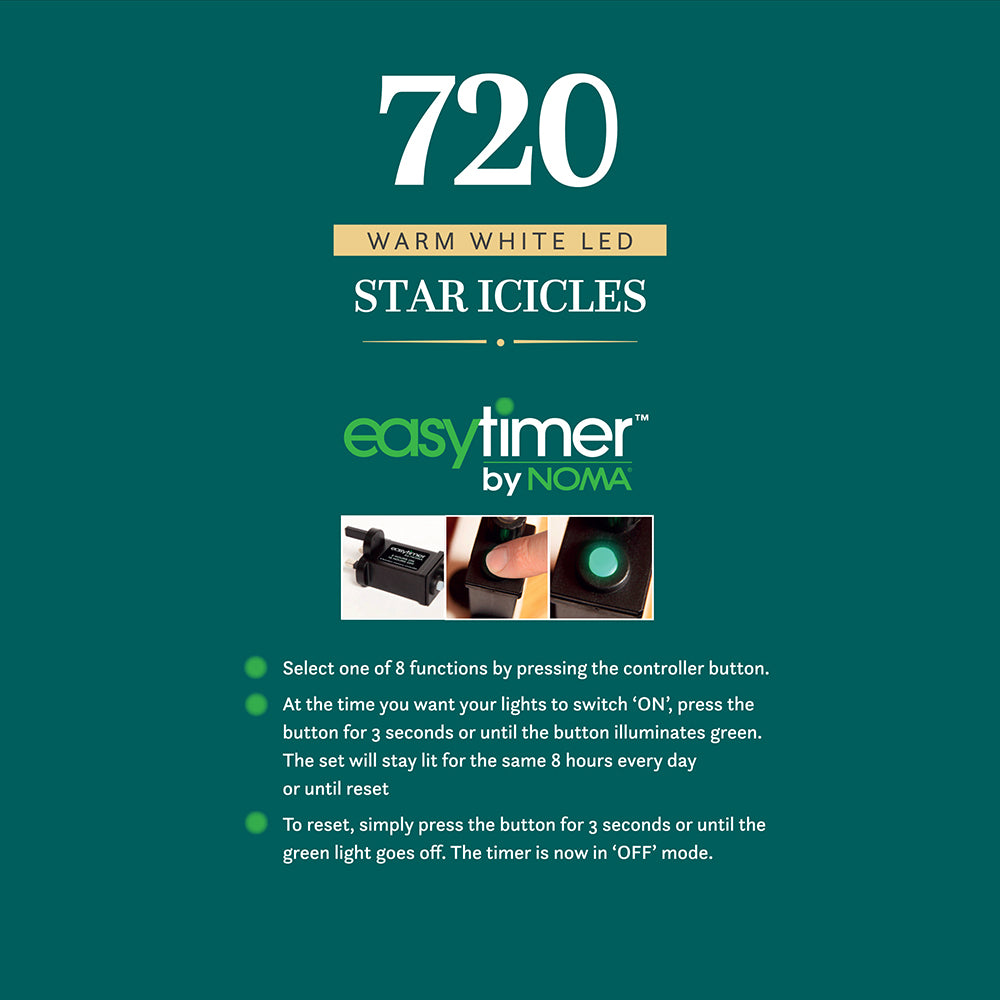 Transform your space with the 720 Warm White Star Icicle Lights with Clear Cable. These enchanting lights feature 720 warm white LEDs, each ending in a charming star for an added touch of magic. With 8 multifunction settings, including a static option, and our convenient EasyTimer, you can easily create the perfect ambiance. The set measures 1430 x 60cm with 10 cm bulb spacing and includes a 5m lead cable for flexible placement. Ideal for both indoor and outdoor use, these lights will bring a sparkling and festive atmosphere to any setting.