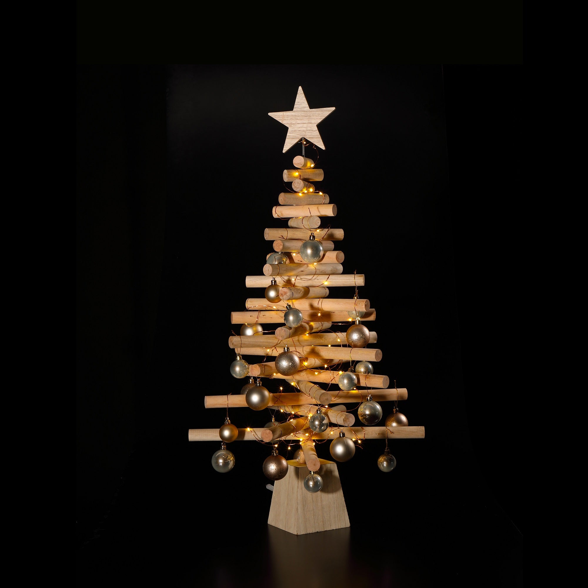 Discover a charming twist on traditional décor with the 88cm Wooden Christmas Tree. This easy-to-assemble tree comes adorned with 30 gold and champagne baubles and 60 warm white wire LEDs, offering a festive glow. Battery-operated for convenience, it includes an On/Off/Timer feature, making it a delightful and practical alternative to standard Christmas trees. Perfect for adding a touch of rustic elegance to your indoor holiday setting.