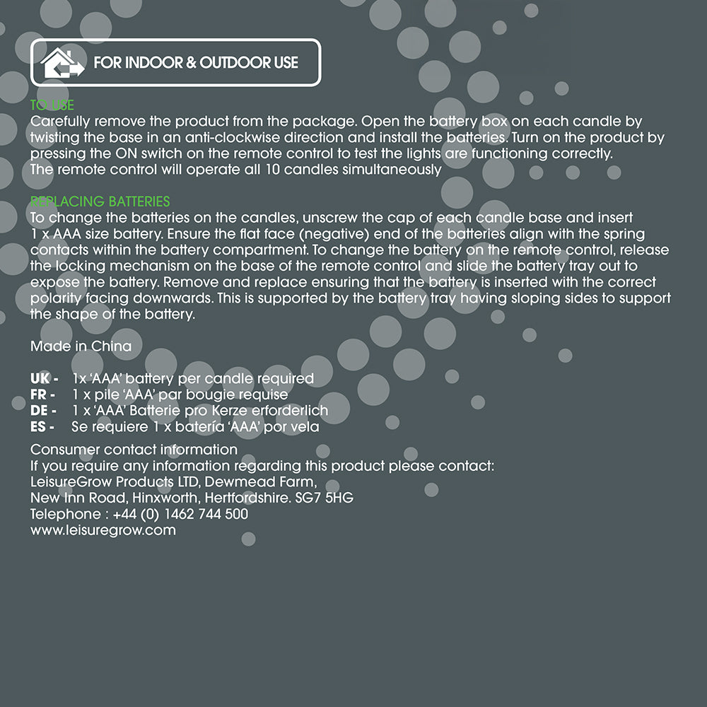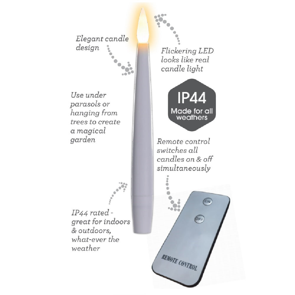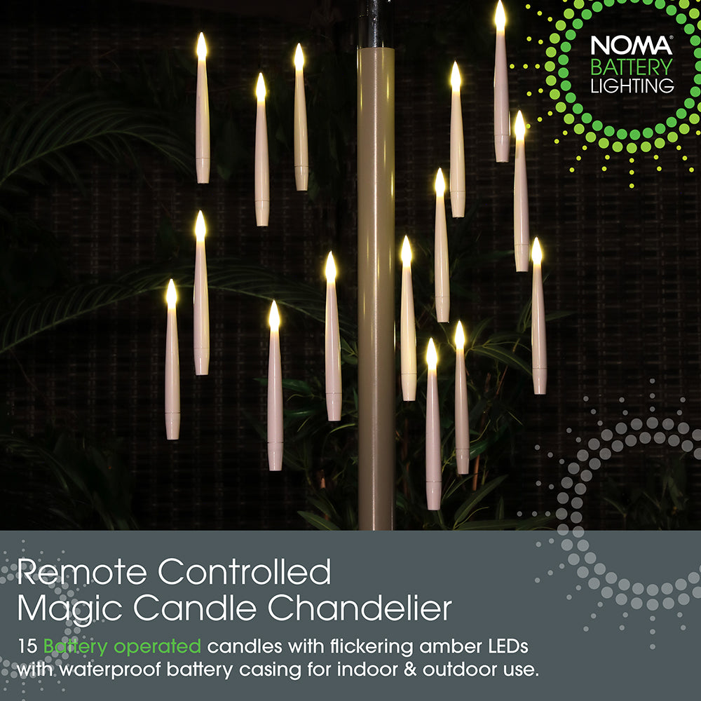 Bring a little magic into your garden with this lightweight, waterproof chandelier, perfect for hanging under parasols. Featuring 15 realistic flickering effect candles, it creates a warm, enchanting glow. Easily switch the candles on and off with the included remote control, making it a hassle-free addition to any outdoor space. Battery operated for convenience and designed to withstand the elements, it's the perfect way to add a touch of charm to your evenings.