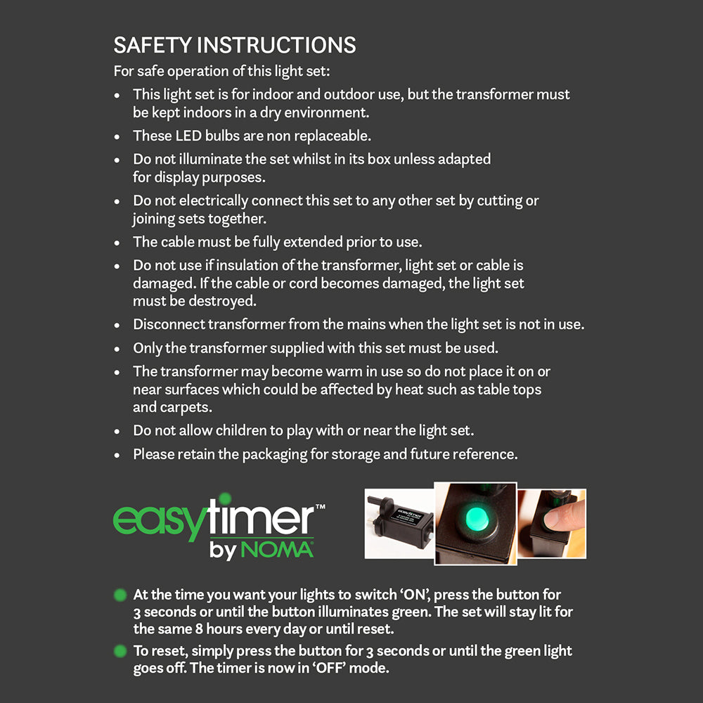 Bring modern festive charm to your garden with this set of 3 white neon star stakelights. Standing at 42cm tall, each stakelight features a crisp white LED and is spaced 50cm apart for a balanced display. With a 5m lead cable and NOMA EasyTimer technology, they’re as convenient as they are eye-catching - simply set them up and let the glow take care of the rest.